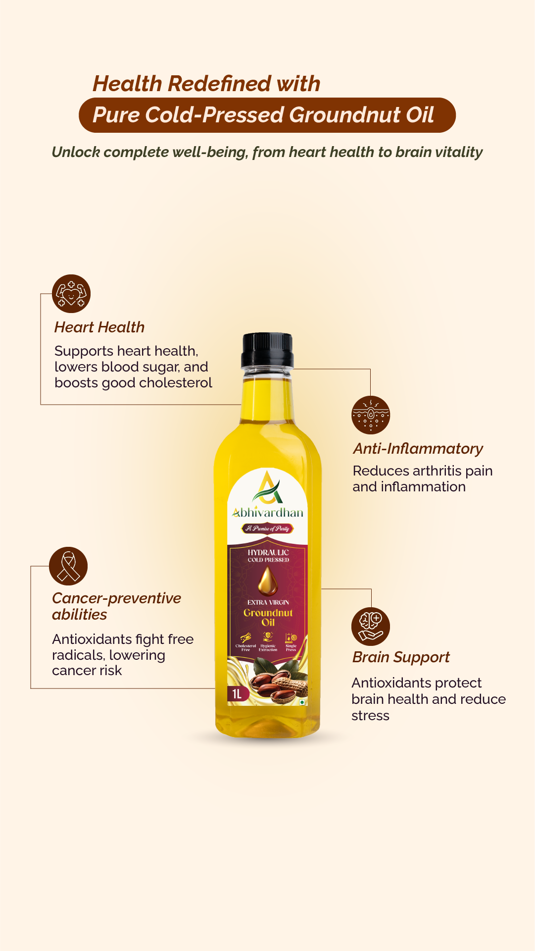 Abhivardhan Hydraulic Cold-Pressed Groundnut Oil – Extra Virgin, 100% Pure, Unrefined, and Chemical-Free