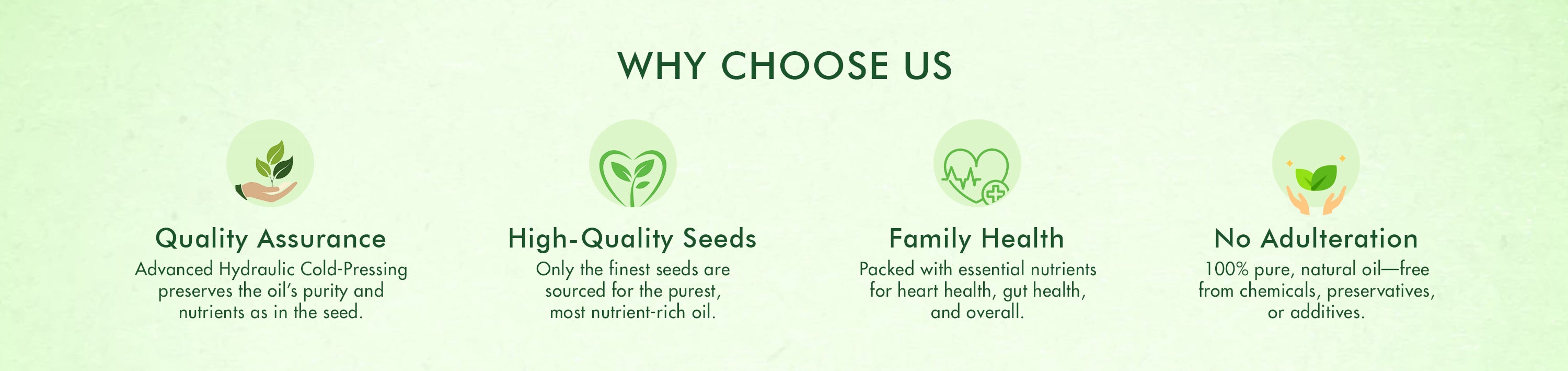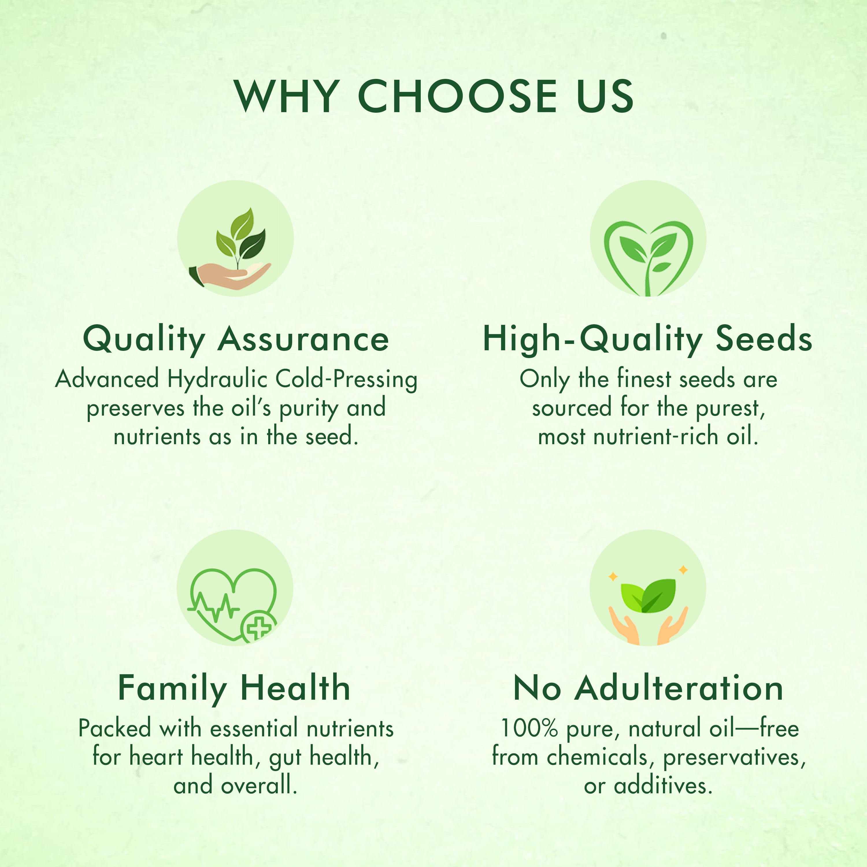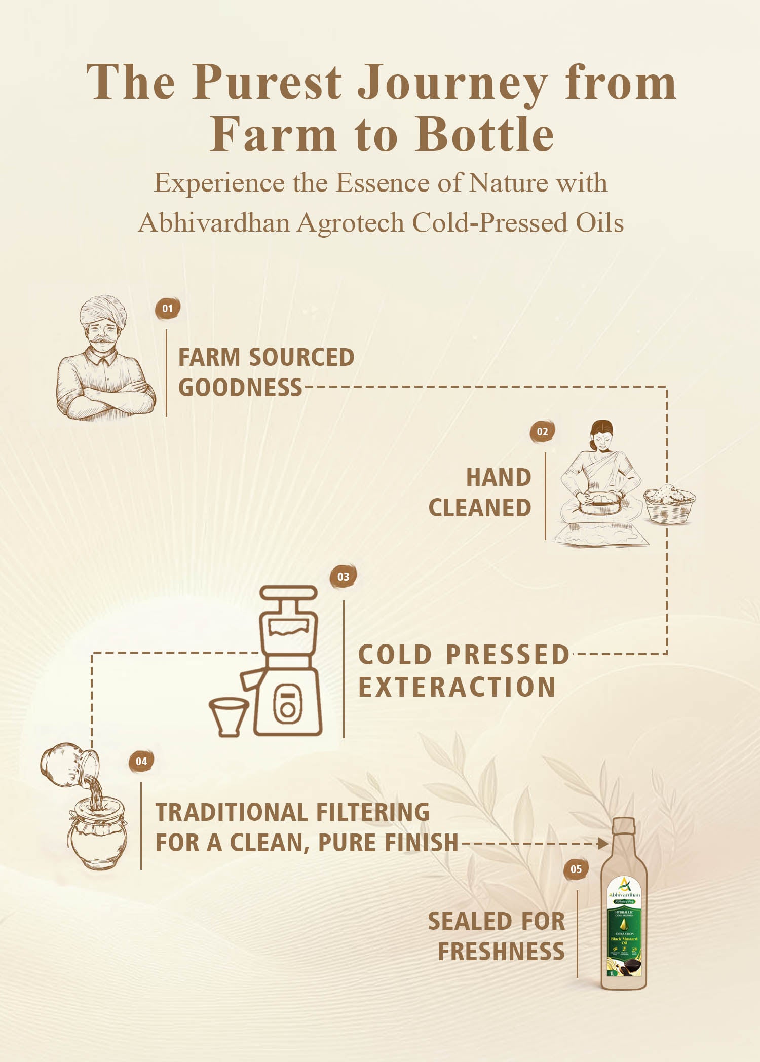 Our cold-pressed oil is extracted using a traditional, chemical-free process that preserves its natural nutrients, aroma, and purity. By using a slow, low-heat extraction method, we ensure a rich balance of monounsaturated (MUFAs) and polyunsaturated fatty acids (PUFAs), delivering a healthier and more flavorful oil straight from nature to your kitchen.