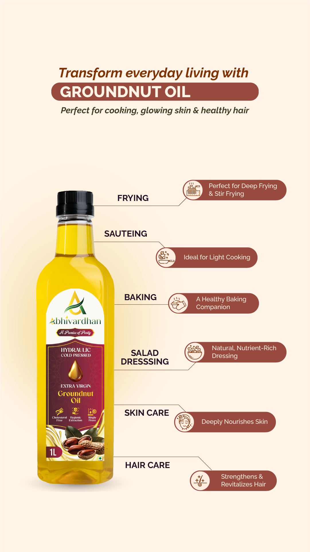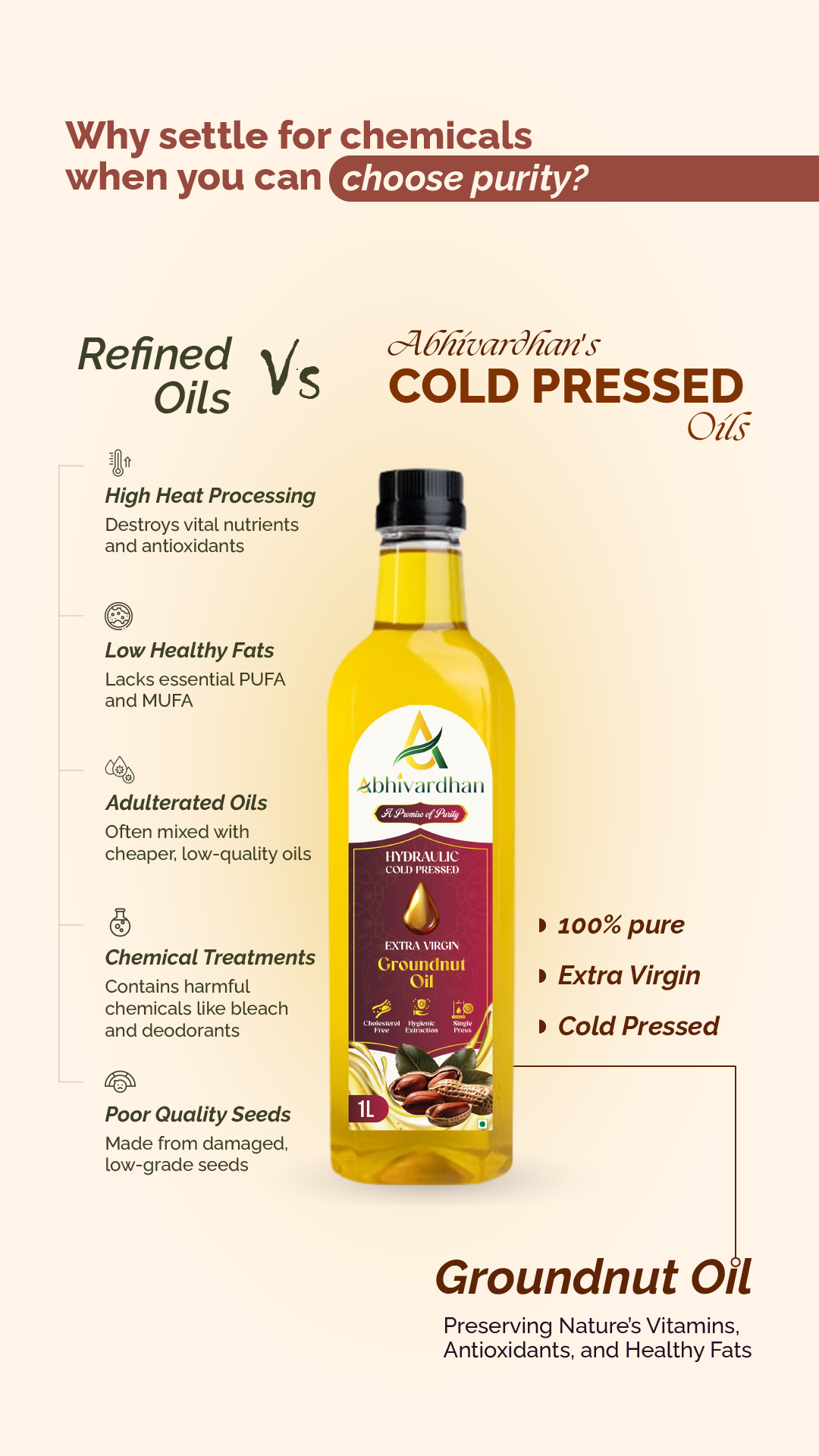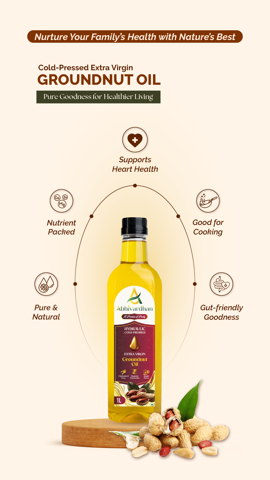 Abhivardhan Hydraulic Cold-Pressed Groundnut Oil – Extra Virgin, 100% Pure, Unrefined, and Chemical-Free
